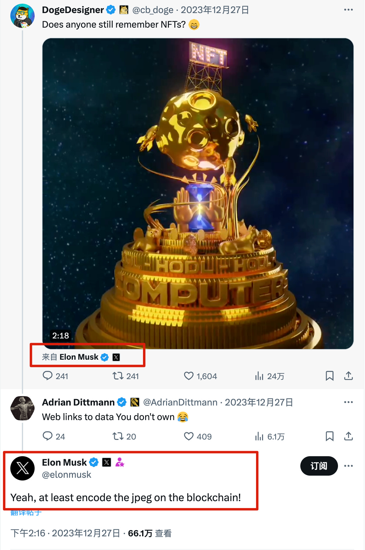 23 年 12 月底,马斯克在引用他之前视频的推下回复「至少将图片上链」,并用自己的帐号重新发了一遍这个视频