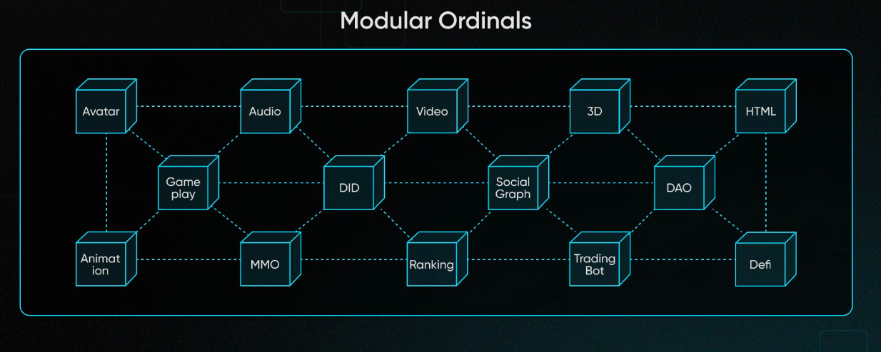 作为递铭文领域的先驱者,协议通过丰富的文件格式支持和统一开源的标准制定,使得所有基于此发行的 NFT 都可以互相组合调用。创作者可以借此开发复杂的资产格式,并将内容生成为模块(如游戏物品、效果模块等),从而实现 Ordinals 上的「模块化开发」。